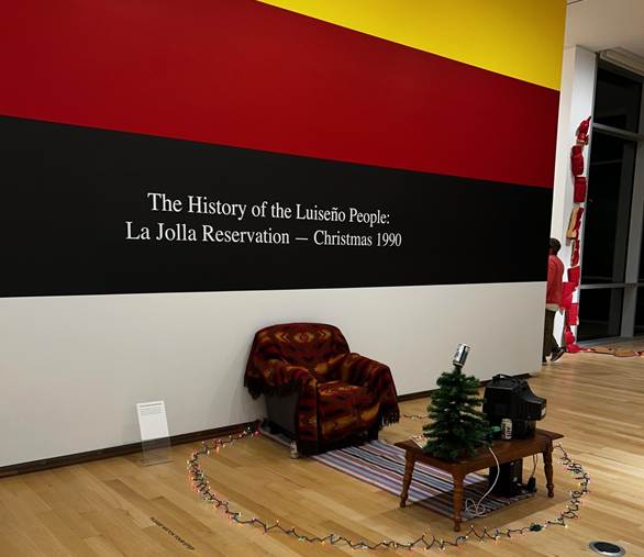 James Luna. The History of the Luiseño People: La Jolla Reservation, Christmas, 1990. Armchair, TV, DVD player, speakers, artificial Christmas tree, beer cans, telephone, Christmas lights, tabloid magazine, rug, and blanket. Gochman Family Collection.