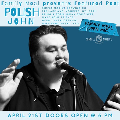 On Monday, April 21st, Family Meal Open Mic returns to Simple Motive Brewing for another night of poetry readings and performances. This month’s featured poet is Polish John (@JohnDWrites), a local musician, poet, trivia host, and Yonkers native. RSVP on the Family Meal website here.